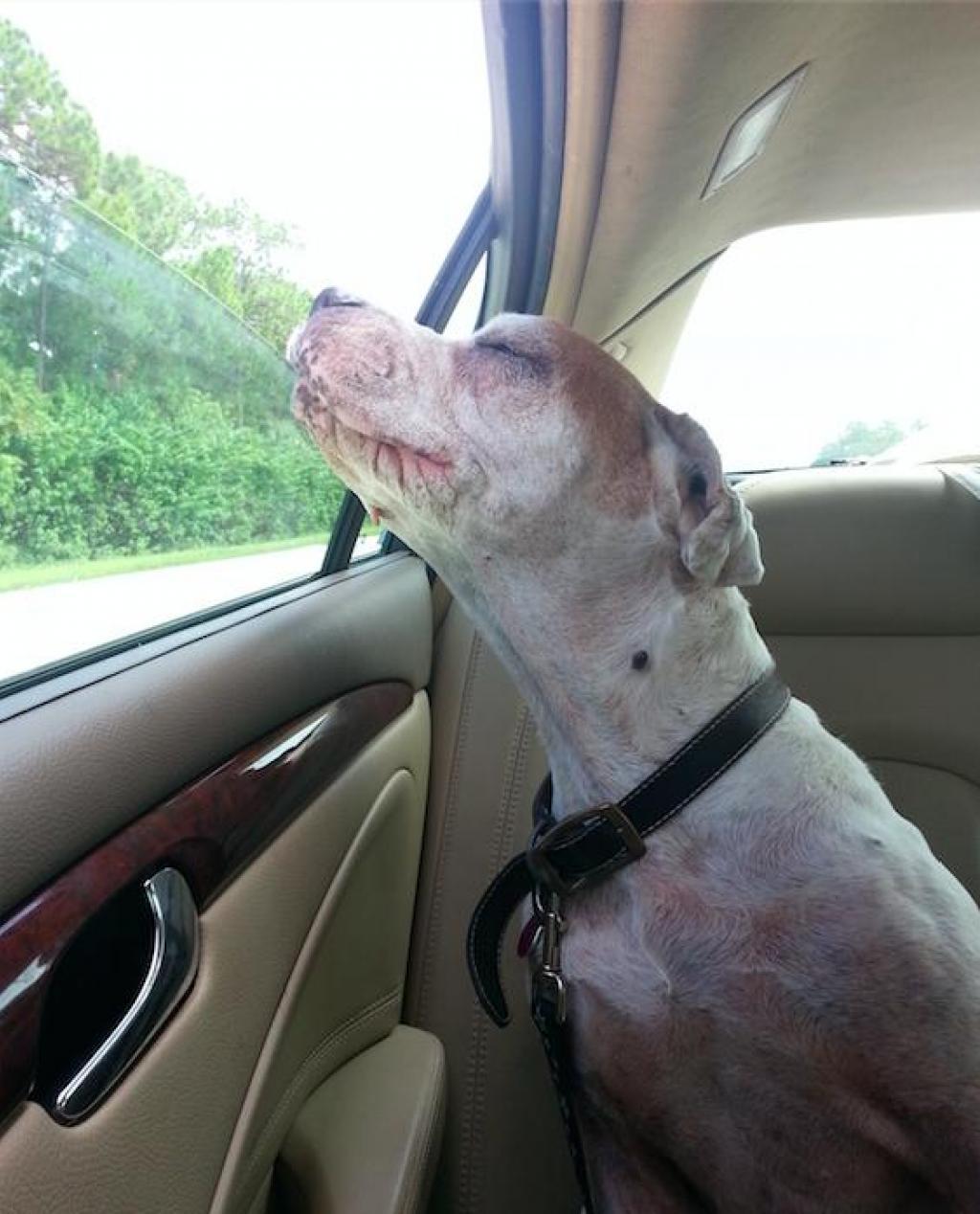 La photo montre l'animal les yeux fermés, le museau en train d'humer l'air frais par la fenêtre, comme si elle respirait une pleine bouffée de vie une dernière fois.