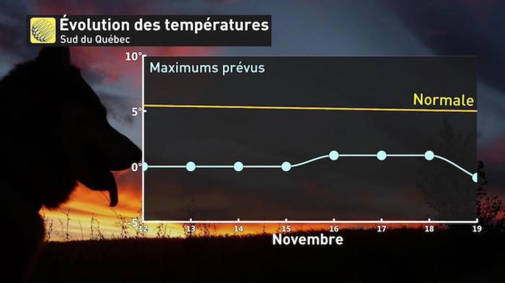 Pour le moment, on sait que cette première poussée de froid commencera en fin de semaine prochaine, puis c'est au coeur de la semaine prochaine qu'on aura droit au pire du pire. André Monette explique: "On parle de sept jours où les températures maximums auront de la difficulté à dépasser le zéro : au sud, le mercure oscillera entre -1 °C et 1 °C, alors pour les autres secteurs, ça sera encore pire. [...] La nuit, on pourrait facilement descendre entre les -5 °C et les -10 °C."