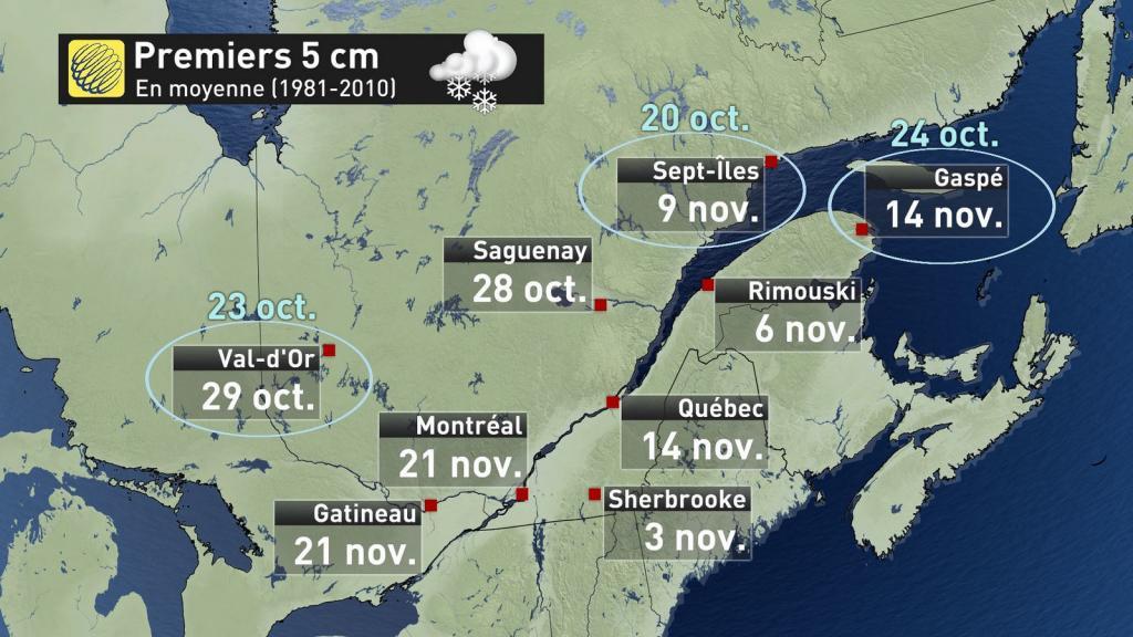 Il faut savoir qu'entre vendredi et dimanche, d'autres secteurs pourraient aussi avoir droit à leur première bordée de neige et parmi ceux-ci, on y retrouve l’Abitibi-Témiscamingue, la Côte-Nord, la Haute-Mauricie, les Laurentides, la Beauce et l’Estrie. Notez bien que pour ce qui est des Laurentides, de la Beauce et de l’Estrie, ces secteurs pourraient aussi avoir droit à leurs premières accumulations de neige au sol pour la saison.