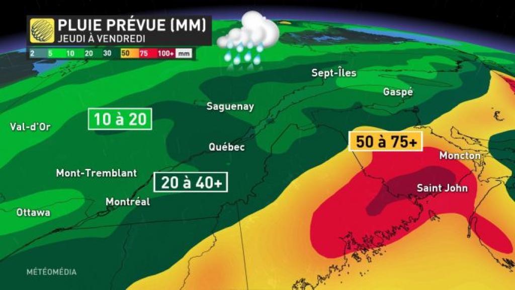 Le sud du Québec pourrait connaître un important épisode de pluie alors que des secteurs pourraient recevoir jusqu'à 75 millimètres d'ici vendredi, particulièrement le long de la frontière américaine.