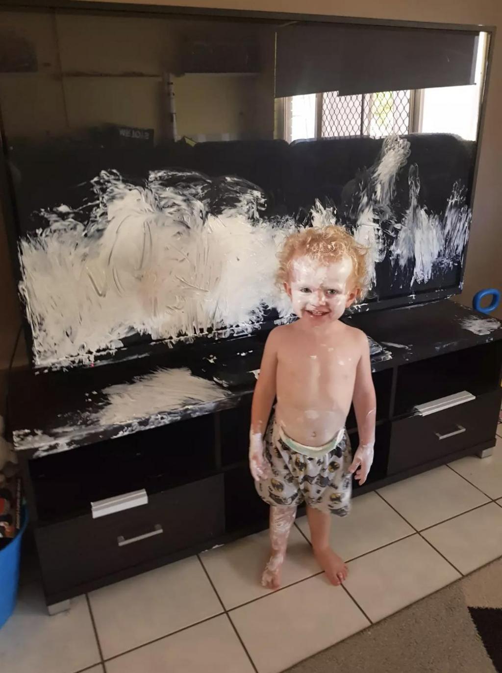 C'est LADbible qui rapporte l'histoire de Sarah Wruck, une mère de famille australienne dont les enfants lui ont joué un mauvais tour le dimanche 5 janvier dernier. Alors qu'elle voulait faire du thé, elle a décidé de laisser de deux ses enfants sans surveillance pendant 5 minutes. Il n'en fallait pas plus à Ben et Eli, âgés respectivement de 12 mois et de 2 ans pour la faire la plus grosse bêtise de leur courte existence. En effet, le petit Eli en a profité pour recouvrir de crème la télévision familiale. Oui, vous avez bien lu.