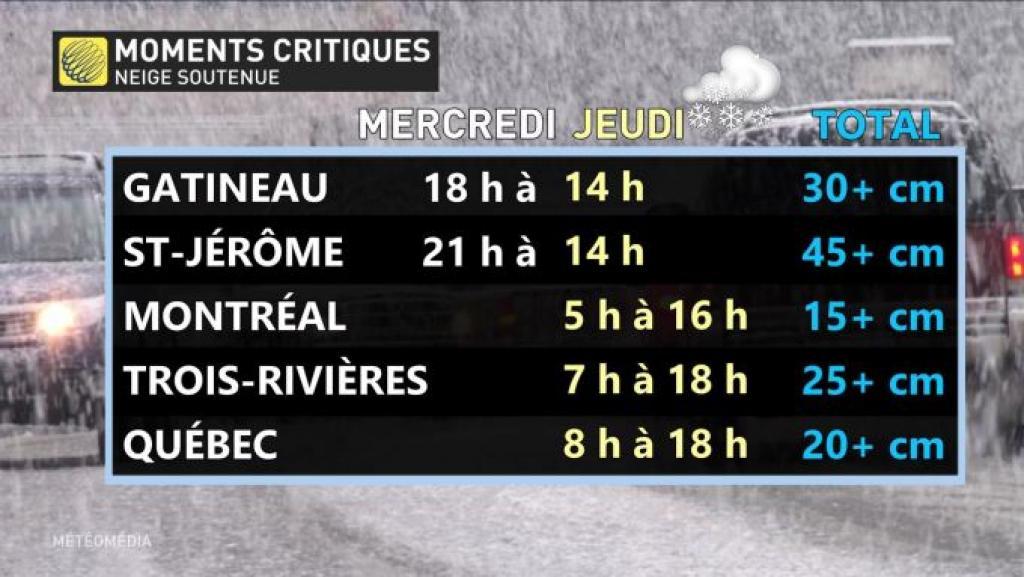 En effet, les prévisions en cours indiquent présentement qu'on pourrait voir tomber jusqu'à 45 cm de neige dans les secteurs comme l'Outaouais, les Laurentides, Lanaudière, le Bas-Saint-Laurent et la Gaspésie.